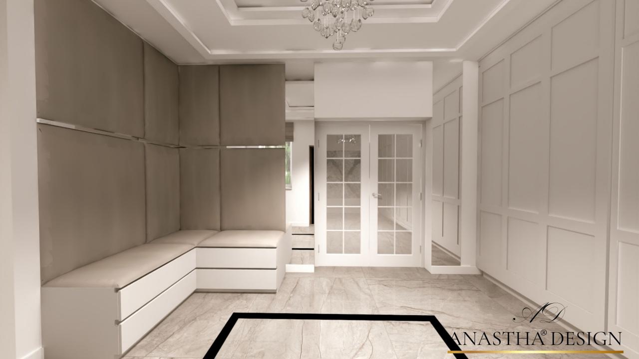 elegancki hol, siedzisko w holu, projektowanie wnętrz, architekt wnetrz Anna Trawczyńska, Anastha DESIGN (1) 29379 20230419 033716